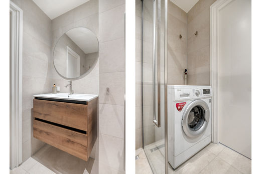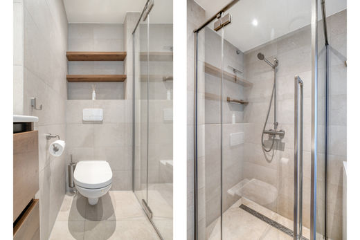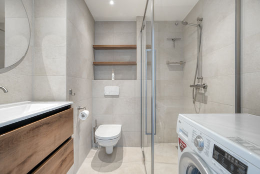 De moderne badkamer (vernieuwd in 2023) is volledig betegeld en voorzien van een inloopdouche, wastafelmeubel en toilet. De afwerking is modern en eigentijds.