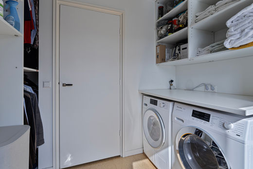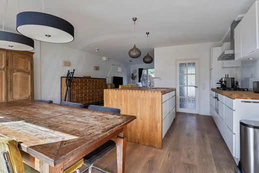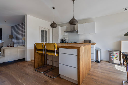 Via de entree met hal en modern toilet kom je binnen in de ruime, lichte woonkamer. Deze is voorzien van airconditioning, grote raampartijen en een elektrisch zonnescherm. De luxe open keuken is compleet ingericht met hoogwaardige inbouwapparatuur: een AEG 5-pits gaskookplaat, Siemens-afzuigkap, combimagnetron, Liebherr-koelkast, Quooker en Miele-vaatwasser. Een fijne ruimte om te koken en samen te komen.