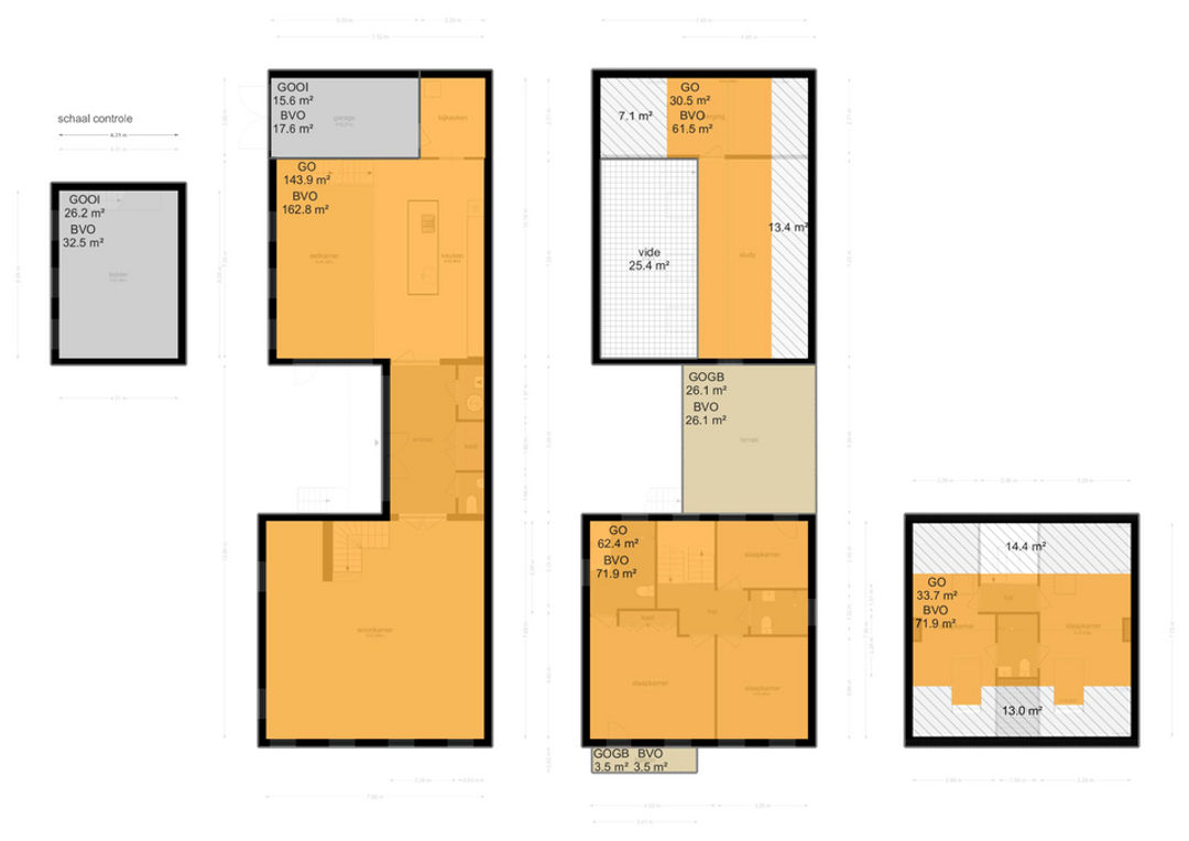 De NEN meting inclusief kelder en garage is 320 m² exclusief garage en kelder is 270 m². Vanzelfsprekend mag u zelf kiezen of u de kelder en/of garage ingebruikname als kamer of als overig inpandige ruimte.