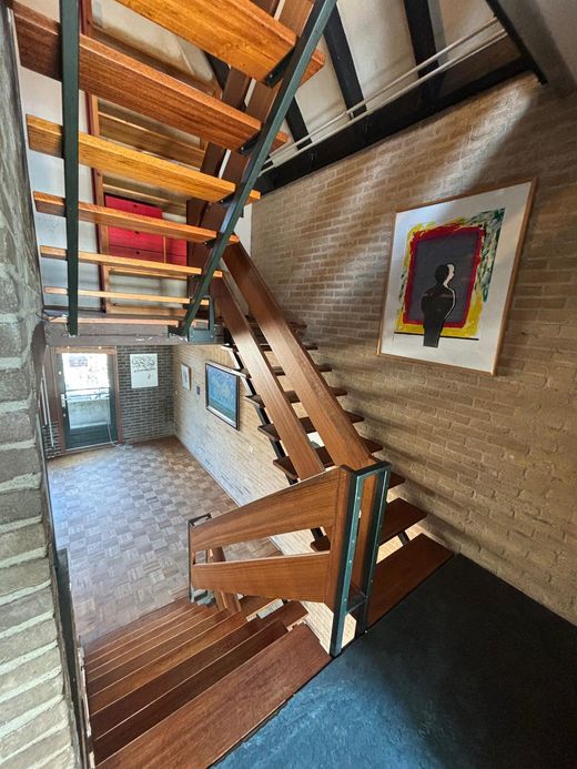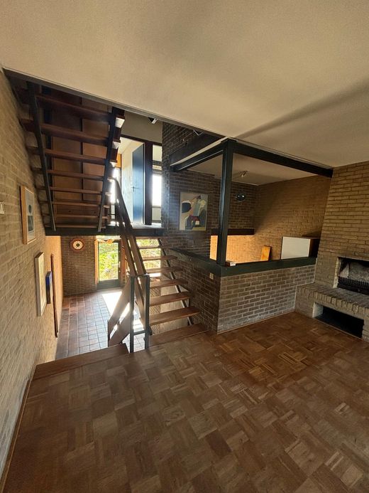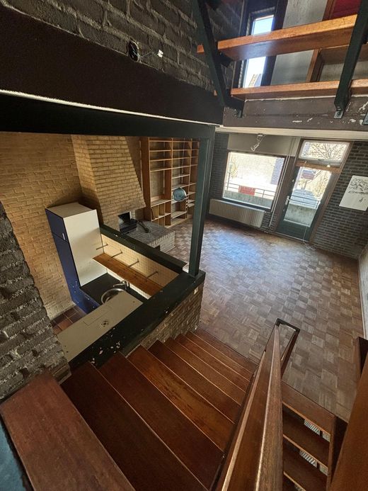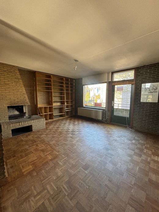 Het 3e woonniveau is een woonkamer met openhaard en balkon.