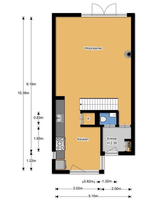 indeling: entree met toilet, woonkamer, half open keuken, openslaande deuren naar de tuin, trap naar de vide